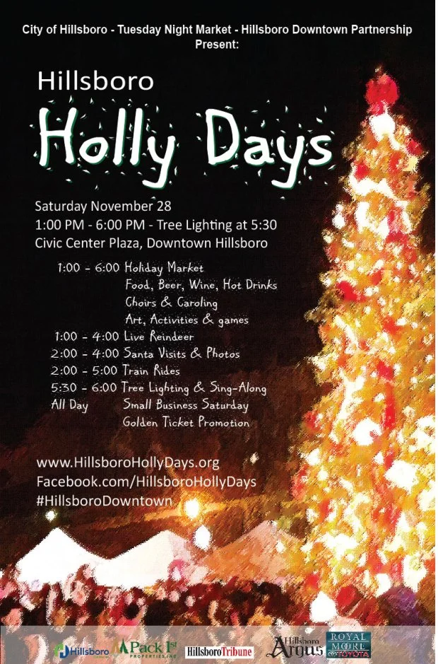 We'll be at Hillsboro Holly Days tomorrow, from 1-6. Come see live reindeer, Santa, the tree lighting, and all sorts of fun things to see, eat, drink and do in downtown Hillsboro tomorrow.